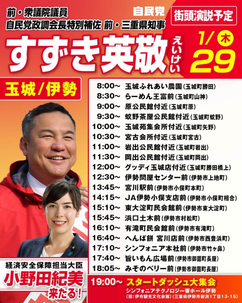 衆院選3日目は、玉城町・伊勢市へ。19時からは、小野田紀美 経済安全保障担当大臣にご登壇いただくスタートダッシュ大集会を開催します。ぜひ現地でお会いしましょう!