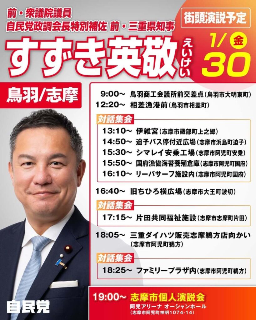 連日、街頭演説に多くの皆さんにお集まりいただき、本当にありがとうございます。衆院選4日目は、鳥羽市・志摩市へ伺います。19時からは阿児アリーナ オーシャンホールで、志摩市個人演説会を開催します。ぜひ、私の思いを直接お聞きください!