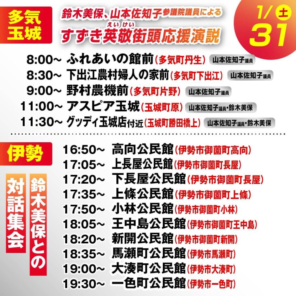 私が地元に不在の間は、多気町・玉城町・伊勢市において、鈴木美保、山本佐知子 参議院議員等による街頭応援演説・対話集会を行います。