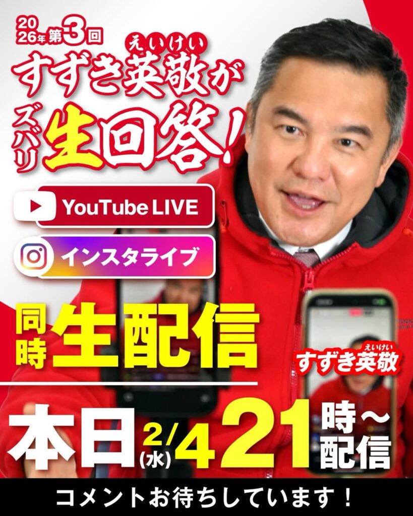 本日2月4日(水)21時から、「すずき英敬がズバリ生回答!」第3回を開催します