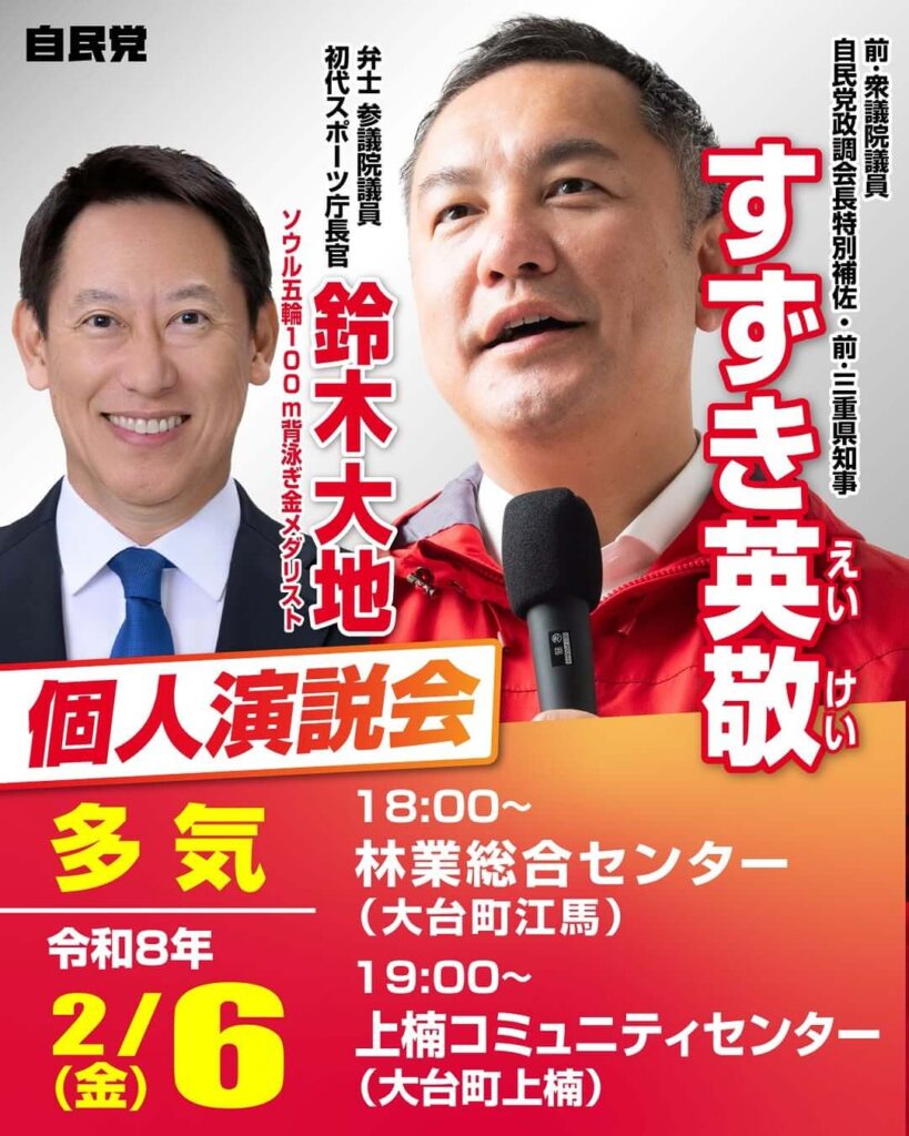 2月6日(金)鈴木大地 参議院議員(初代スポーツ庁長官/ソウル五輪 金メダリスト)が応援に駆けつけてくださいます