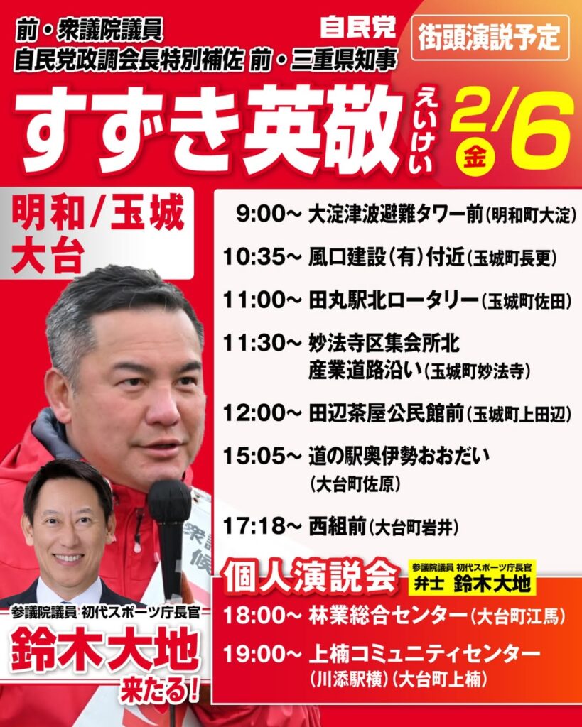 衆院選11日目は、明和町・玉城町・大台町へ。大台町では、鈴木大地 参議院議員・初代スポーツ庁長官をお迎えした個人演説会を開催します。皆さんと直接お会いできるのを楽しみにしています!!