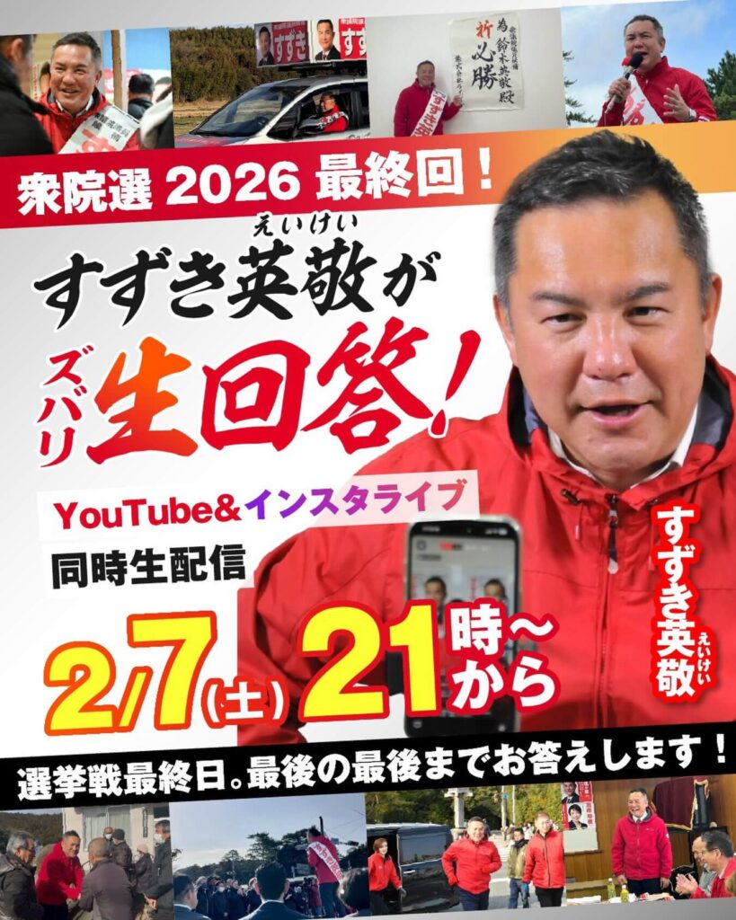 本日2月7日(土)21時から「すずき英敬がズバリ生回答!」2026衆院選 最終回を開催します