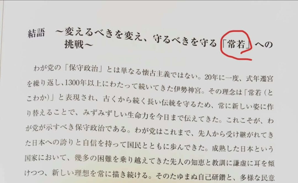 「20年に一度、式年遷宮を繰り返し、1300年以上にわたって続いてきた伊勢神宮。その理念は「常若(とこわか)」と表現され、古くから続く長い伝統を守るため、常に新しい姿に作り替えることで、みずみずしい生命力を今日まで伝えてきた。これこそが、わが党が示すべき保守政治である。わが党はこれまで、先人から受け継がれてきた日本への誇りと自信を持って国民とともに歩んできた。成熟した日本という国家において、幾多の困難を乗り越えてきた先人の知恵と教訓に謙虚に耳を傾けつつ、新しい理想を常に描き続ける。」、と。