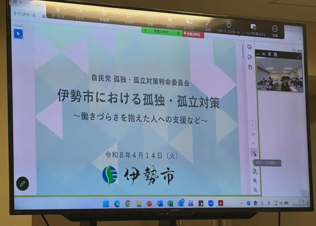 前日14日には、孤立孤独特命委員会で、鈴木伊勢市長がオンラインで、働きづらさ抱える方々への伊勢市独自の支援の仕組みについてプレゼンをしてくれました。大変高い評価を受けました。