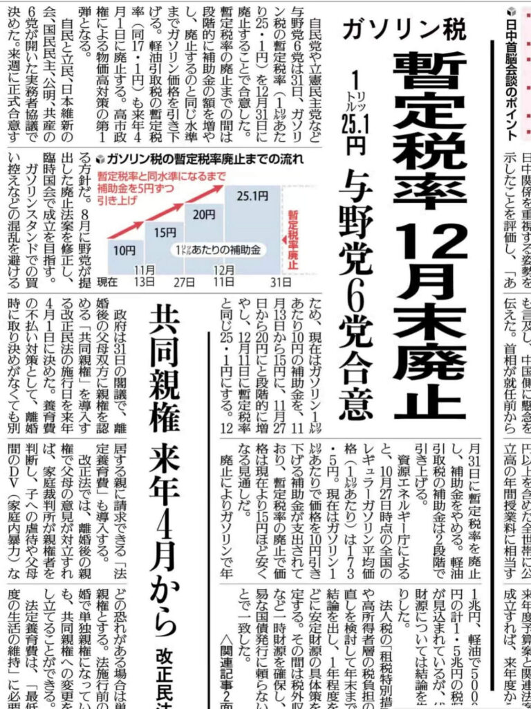 ガソリン暫定税率の廃止を与野党6党で合意。関係者の皆様に感謝。高市政権での物価高対策第一弾ともなります。暫定税率廃止は12月31日ですが、実際には12月11日で、暫定税率分(25.1円)の引き下げが実現します。現在既に補助金で10円下がってますので、更に11月13日から15円下げ、11月27日から20円下げ、12月11日に暫定税率と同じ25・1円下げとなります。ちなみに、現在10月27日時点の全国のレギュラーガソリン平均価格は173・5円。